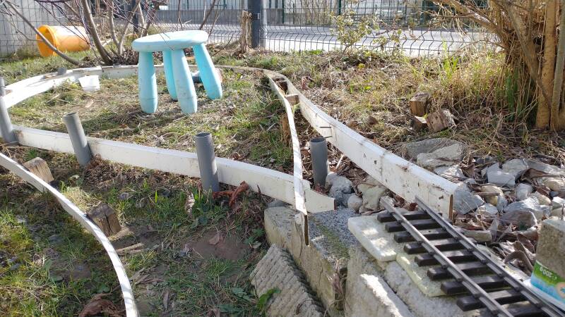 Danach errichtete ich südlich von Gneis-Moos etwa 3m des Trassenunterbaus bis zum Kiesweg. Sogar die Brückenpfeiler habe ich povisorisch eingerichtet - Das Betonieren ist ja bei den derzeitigen frostigen Nächten noch nicht möglich.