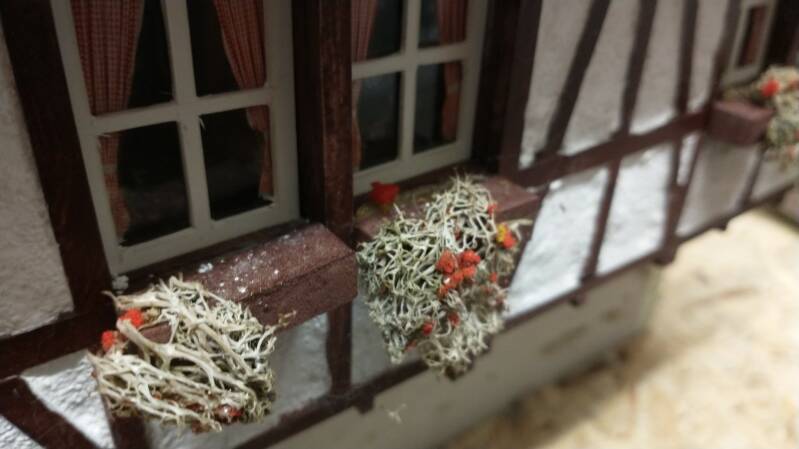 Die Fensterblumen an meinen Häusern hatte ich ja ursprünglich mit Islandmoos gemacht - dies hat sich im Freien jedoch als unbefriedigend herausgestellt. Das Moos hat seine grüne Farbe verloren und ist spröde und hart geworden.