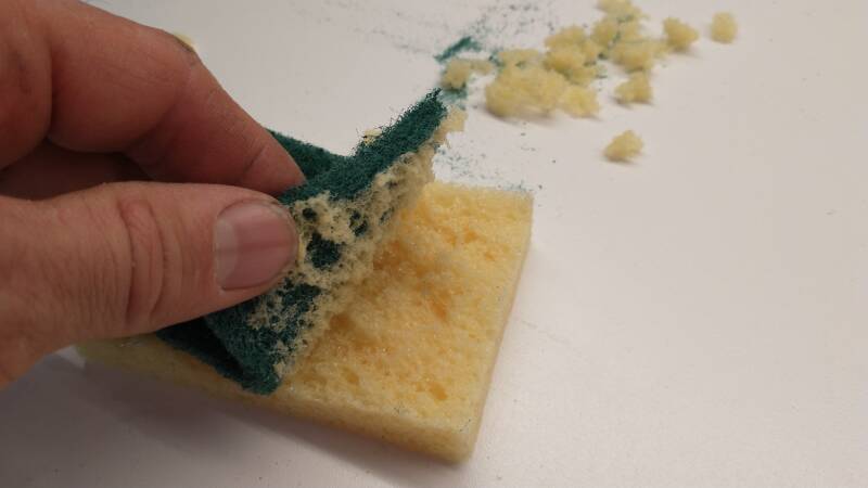 Nun versuche ich eine neue Variante. Dazu verwende ich einfach Spülschwämme. Die rauhe Kratzschicht wird zuerst abgelöst und mit der Schere in Streifen geschnitten.